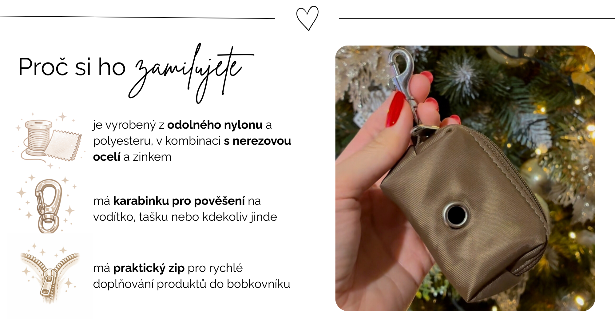 Pouzdro na sáčky s karabinkou nabízí možnost pověšení přímo na vodítko nebo tašku. Díky otvoru lze pytlíčky rychle vytahovat, a pomocí zipu jednoduše doplnit.