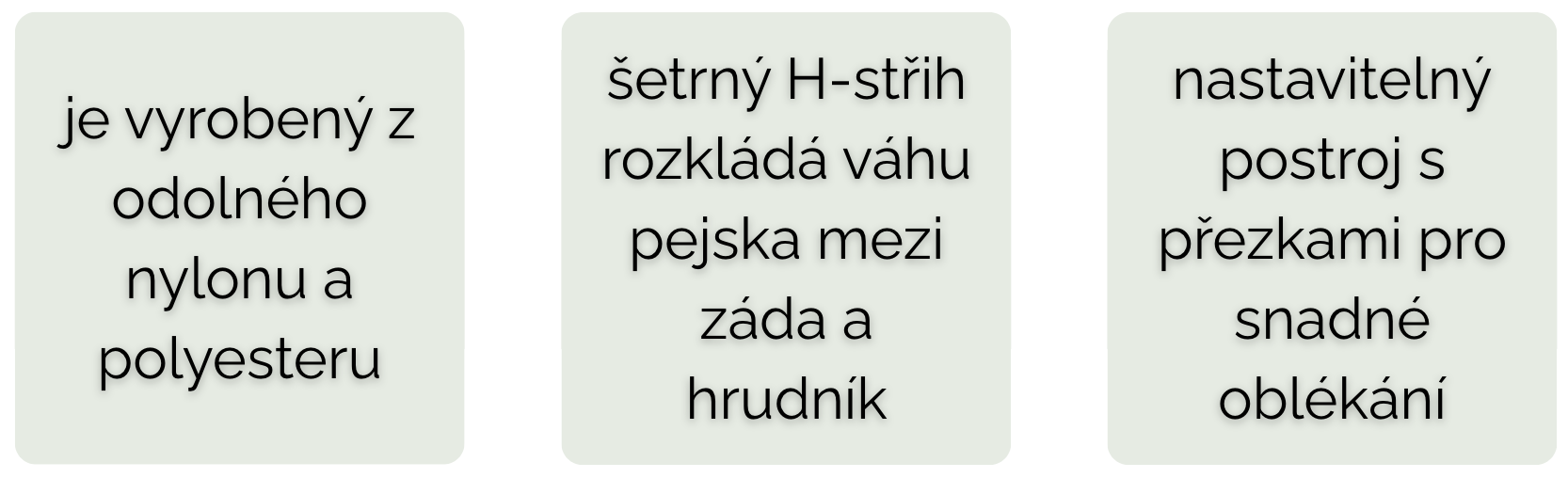 Klasický střih postroje v tvaru písmena H nevede přes ramena ani lopatky, což umožňuje plný rozsah pohybu předních končetin pejska. Díky tomu je vhodný pro psy s aktivnějším životním stylem. Pokud pejsek táhne, síla se rozloží na hrudník a záda psa, což je bezpečnější pro krk a dýchací cesty než tlak způsobený běžným obojkem. Použité materiály nylon a polyester umožňují jednoduché čištění a údržbu postroje (stačí ho otřít vlhčeným hadříkem). Stříbrné kování je vyrobeno z nerezové oceli nebo zinku.