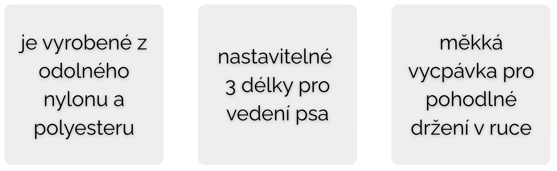 Je praktickým pomocníkem pro každodenní procházky v přírodě i ve městě. Je složeno ze 3 částí popruhu, přičemž každá část nabízí přepnutí vodítka na různou délku. Pro pohodlné držení v ruce byla tato část vodítka zpevněna měkkou vycpávkou. Použité materiály nylon a polyester umožňují jednoduché čištění a údržbu obojku (stačí ho otřít vlhčeným hadříkem). Stříbrné kování je vyrobeno z nerezové oceli nebo zinku.